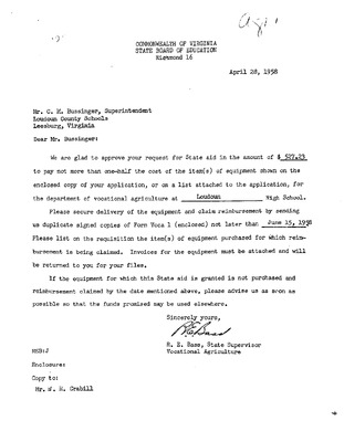 EWP 5-2 Yr 1958 State Aid for Loudoun HS Ag Vocational Training