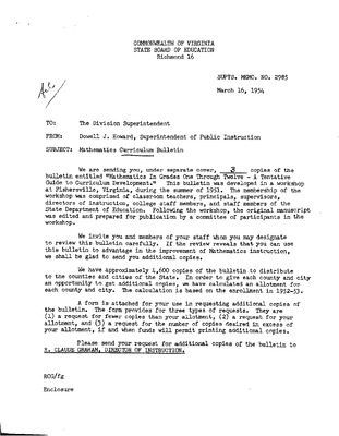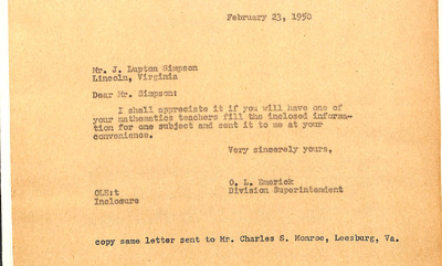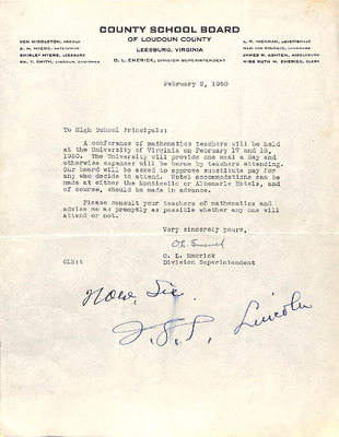 EWP 5-2 Yr 1950 Feb Lincoln Wont go to Unv of Virginia Math Conference