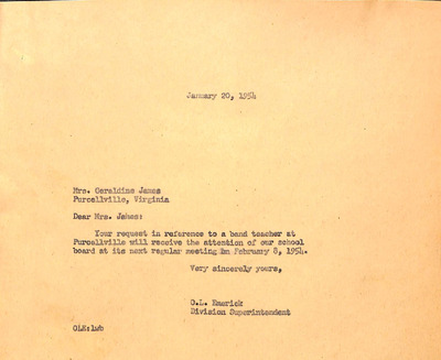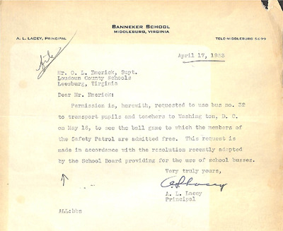 EWP 5-3 Yr 1953 April 17 Banneker wants school bus for Ball Game for Safety Patrol April 17, 1953 correspomdence from Banneker Principal A.L. Lacey to Superintendent O.L. Emerick requesting use of school bus for transportation of teachers and Safety Patrol students to Washington D.C. on May 16, 1953 to attend a baseball game. - EWP 05 5-4-3c High School Struggle