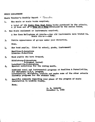 EWP 5-2 Yr 1960 Nov Music Deparment Monthy Report