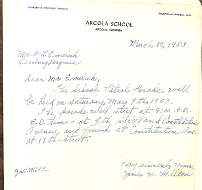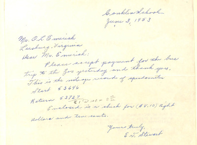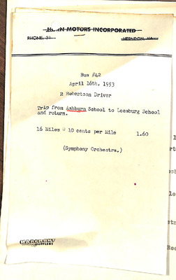 EWP 05-3 Yr 1953 Invoices and payments for Field Trips from Ashburn HS to Leesburg and, Ashburn and Leesburg to Washington DC. April and May 1953 invoices and payments for 4/16/1953 school bus trip from Ashburn to Leesburg in support of symphony orchestra. Invoice and payment for 5/15/2953 trips from Ashburn and Leesburg to Washington DC. Also, a thank you letter dated June 8, 1953 from Ashburn and Mountain Gap schools for Emerick's permission to take a June 2, 1953 trip to Richmond, Colonial Williamsburg, Jamestown and Yorktown. -