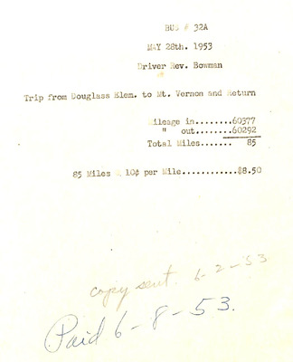 EWP 05-3 Yr 1953 Invoice and payment for Douglass Elementary field trip to Mt Vernon May 28, 1953, Invoice and payment for field trip from Douglass Elementary to Mt Vernon. -