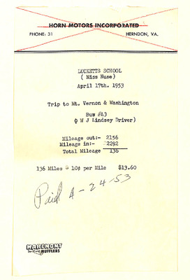 EWP 05-3 Yr 1953 Invoice and payment for Lucketts Elementary field trip to Mt Vernon and Washington DC Zoo and TV Show April 17, 1953 Invoice and payment for field trip from Lucketts to Mt Vernon; April 24, 1953 Invoice and payment for field trip from Lucketts to Washington DC Zoo; May 26, 1953 Invoice and payment for field trip from Lucketts to Washington DC TV Show. Trips taken in buses 38 and 43. - EWP 5-3 Yr 1953 Lovettsville HS to Leesburg Government Study Trip