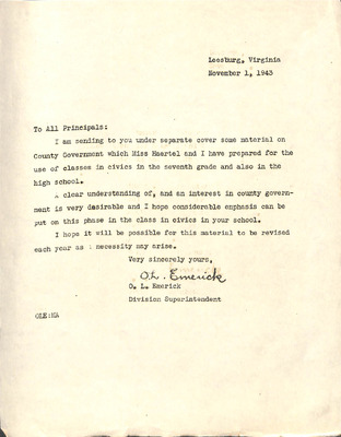 EWP 03 1947-1949 announcements, permission slips and bus schedules for Williamsburg Field Trip, Including "Common Glory" play Records include: 1947 - 1949 announcements regarding opportunity for Junior and Senior high school students to tour historic Williamsburg, Yorktown and Jamestown sites as well as attend the historic re-enactment play "Common Glory"; permission slips and school bus schedules for attendees signed by LCPS Superintendent O.L. Emerick; list of attendees - date unknown; announcements from State Superintendent of Public Instruction G. Tyler Miller.