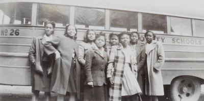 Douglass Students next to School Bus # 26 - 1940's Douglass students next to school bus # 26. Photo taken in the 1940's. Driver records show John Tolbert Jr. drove bus # 26 from 1940-1947 & Glandwood D. Moore drove bus # 26 from 1947 - 1954. -