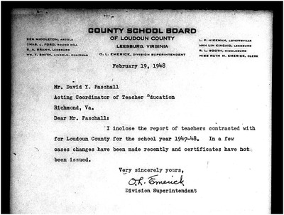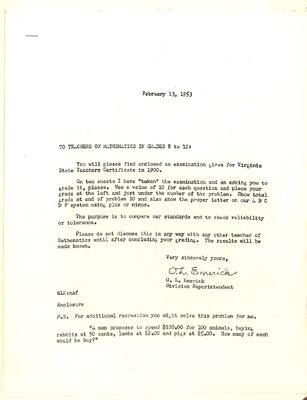 EWP 4-7 Yr 1953 Duplicate Teacher Examination 1900001 Duplicate of Letter Dated February 13,1953, from Division Superintendent, O. L. Emerick to Teachers of Mathematics in Grades 8 to 12. -
