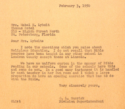EWP 1-3 Yr 1950 2-3 Emerick on History of Bible Reading Loudoun Schools