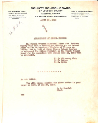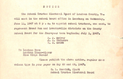 EWP2-3Yr1947MayNoticeofJuneElectoralBrdMeetingonBroadRunandLovettsvilleDistricts In June 1947, the School Trustee Electoral Board of Loudoun County, Virginia published a notice in local newspapers requesting the appointment of school trustees for the Broad Run and Lovettsville districts on the County School Board. The meeting was scheduled for June 11, 1947 at 2 pm in Leesburg, with the term beginning on July 1 of the same year. The names of potential appointees, R. J. McCray, J. S. Whitmore, and W. H. Grubb, were included in the notice. The Clerk of the School Trustee Electoral Board, O. L. Emerick, requested the publication of the notice in newspapers such as the Loudoun News, Loudoun Times-Mirror, and Blue Ridge Herald on May 22 and 29, 1947. -