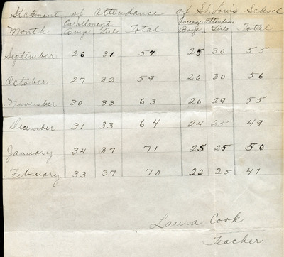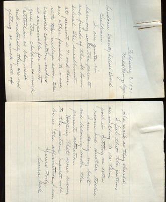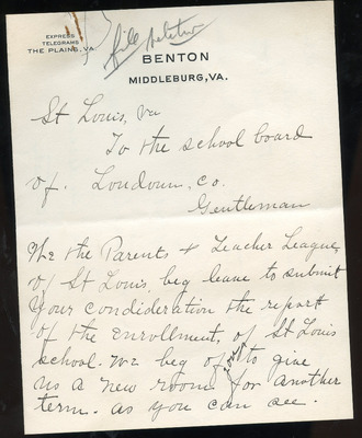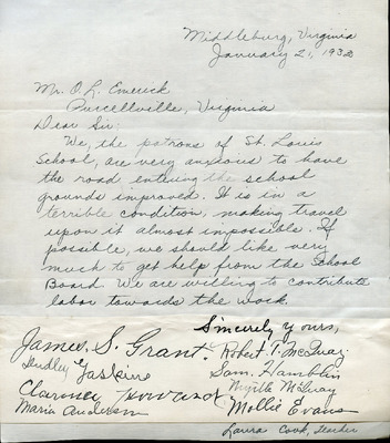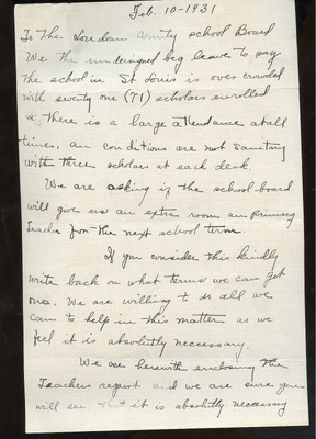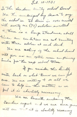EWP 2-5A Petition St. Louis School- Overcrowding Feb 1931 This document is a petition expressing concern for severe overcrowding at the St. Louis School. On February 9, 1931, Laura Cook, a teacher at the school, wrote to the Loudoun County School Board describing how the enrollment of 71 students was hindering her ability to give each child adequate attention. The letter, co-signed by parents and community members, requested an additional classroom and a second teacher for the next school term. The petitioners urged the school board to approve and support these measures to improve learning conditions. The document indicates that a teacher report was attached; however, it is not included with the scanned copy.