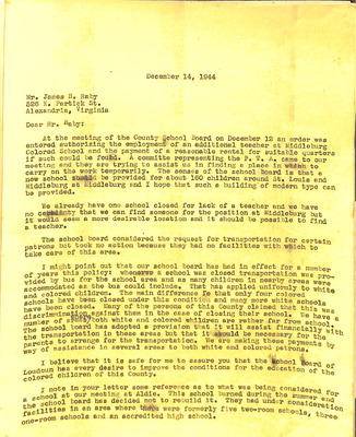 EWP 02.5 A December 14, 1944 Superintendent O.L. Emerick letter to attorney J. Raby on additional colored teacher, new school near St. Louis and Middleburg, alternative school transportation Dec 14, 1944 correspondence from Superintendent O.L. Emerick to attorney James Raby. The letter authorized an additional teacher for the Middleburg Colored School. School Board supports building a new (colored?) school near St Louis & Middleburg. The School Board could not act on a request for public school transportation but did offer to financially compensate parents who arranged private transportation. Letter states that Loudoun County School Board is interested in improving the education conditions of its colored children.