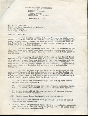 page 3 of 7. PTA of Middleburg complains that Emerick chose badly when picking new location of colored school in Saint Louis, replacing the Grant School in Middleburg. Led by Dr. Edmead, the members wanted Maxville property along Rt 50 owned by William Hall.