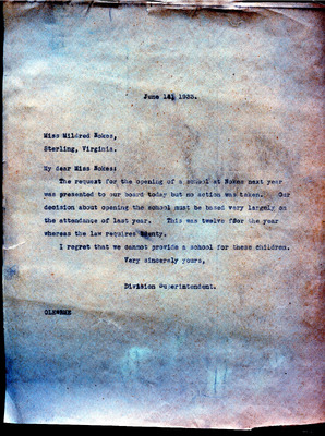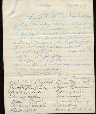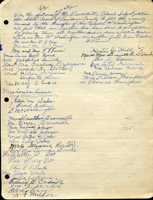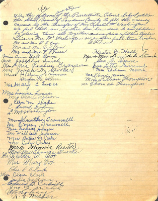 EWP 2-5A Petition Leesburg Colored School May 1932-Teachers This petition, submitted by patrons and supporters of the Leesburg Colored School, requests that Mary E.R. Waters and Annie E. Harris be teachers of record for the 1932-1933 school term. A total of 86 individuals signed the petition 80 identified as "colored" and 6 as white. This petition reflects the community support across racial lines.