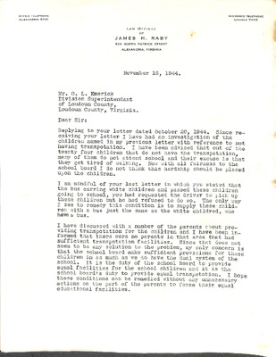 EWP 02-5 A November 16, 1944 Petition from attorney J. Raby to School Superintendent O.L. Emerick requesting school bus transportation for Black children November 16, 1944 petition from attorney James Raby to Superintendent O.L. Emerick requesting school bus transportation for Black children.