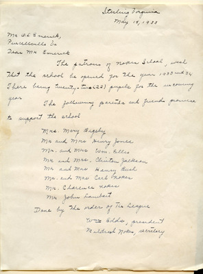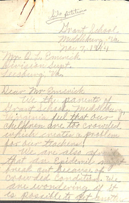 EWP 2-5A 1931 Petition St. Louis School addressing needs of the school This letter of request, written by Laura Cook and signed by petitioning parents, advocates for improvements at St. Louis School in Middleburg, Virginia. The petitioners highlight severe overcrowding, with 71 students currently enrolled and more expected in the next school term. They describe unsanitary conditions, including three students sharing a single desk, and stress the urgent need for expanded facilities. Specifically, they request an additional classroom and a primary school teacher for the upcoming term, emphasizing that these measures are "absolutely necessary." The letter is addressed to the Loudoun County School Board, urging them to take action. Additionally, the document references a teacher’s report containing supporting data, though this report is not available in the current records.