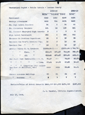 EWP 2-5A Statistical Study 1918-1919 and 1928-1929 side-by-side comparison (1 page) 001 This statistical report from Loudoun County Public Schools covers the 1918–1919 and 1928–1929 school years, specifically, and includes recorded data on student enrollment, number of teachers, teacher salaries, and cost per pupil for instruction. The report distinguishes between white and Negro schools and provides annual comparisons (some data regarding Negro schools may be missing). Additional data includes the number of one- and two-room school buildings and the estimated value of school properties. Costs related to facilities construction or maintenance are not included. This document offers valuable insight into fiscal, staffing, and infrastructure patterns in Loudoun County’s segregated school system during the early 20th century.