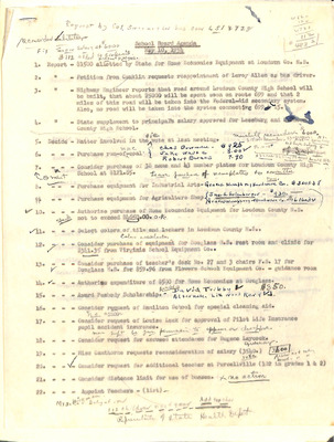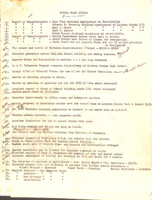 EWP 2-2 May 10, 1954 School Board Meeting Agenda and Minutes May 10, 1954 School Board Meeting Agenda including request from Conklin School for the reappointment of school bus driver Leroy Allen and Highway Engineer report regarding road to be built around Loudoun County High School. Agenda also includes 1954/55 teacher vacancies and recommendations report.
