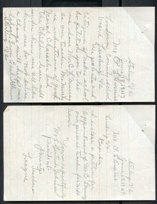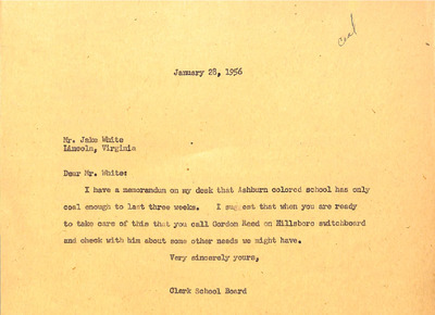 EWP 2-5A Grant School Patrons’ Confirmation Letter Regarding Temporary Relief Plan for Overcrowding (January 15, 1945) This letter, dated January 15, 1945, is addressed to the Loudoun County Superintendent and School Board from the patrons of the Grant School in Middleburg, Virginia. It confirms receipt of the School Board’s earlier communication and acknowledges the proposed plan to address overcrowded conditions by temporarily renting an additional room and appointing a teacher for the remainder of the current school year. The letter also reflects the patrons’ acceptance of the long-term plan to construct a new school once materials and labor become available.