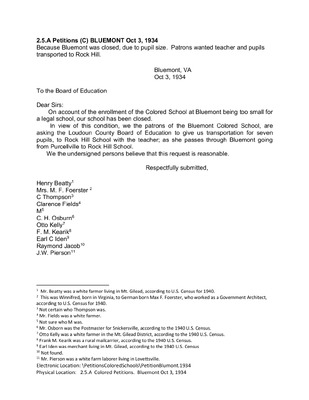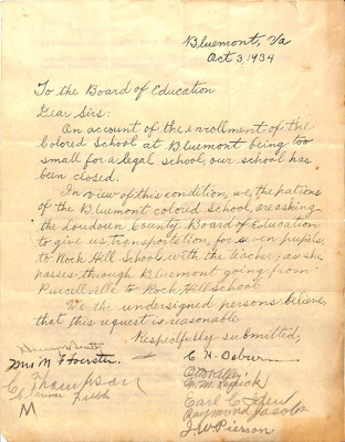 RCH 2-5A Petitions (C) Bluemont and Rock Hill transcript A petition requesting transportation for students and a teacher to Rock Hill School when Bluemont Colored School closed was signed by both black and white residents of the area.