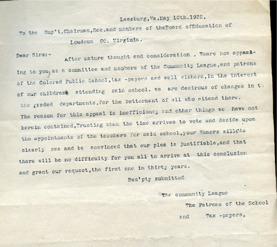 EWP Petition Leesburg 1932 June 001 This letter dated May 10, 1932, from the Community League, patrons of the Colored Public School, and taxpayers in Loudoun County, Virginia, to the Board of Education, highlights a call for change in the graded departments of the school. The appeal for improvements in efficiency and other unspecified concerns reflects a desire for a better educational experience for the children attending the school. After thirty years without change, the community league and patrons are advocating for a justifiable plea to appoint teachers that will address their concerns and enhance the learning environment for their children.