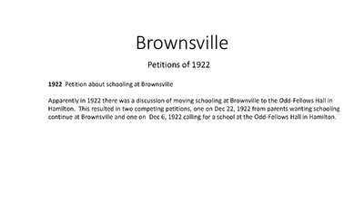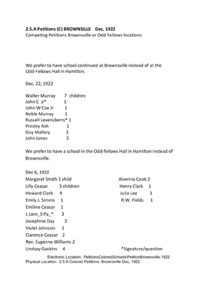 RCH 2-5A Petition (C) Brownsville (1) transcript; Odd-Fellows Hall Hamilton Petition (1) transcript. This file contains two petitions from parents concerning Brownsville and Odd-Fellows Hall Hamilton. These competing petitions request that their children attend the school presumably closest to their homes.