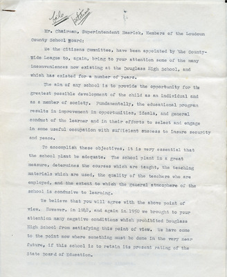 EWP 2-5A Petition Regarding Overcrowding and Curricular Concerns at Douglass High School (circa 1952) This scanned document addresses overcrowded conditions and inadequate support for curricular requirements at Douglass High School in Leesburg, Virginia. The committee, appointed by the County-Wide League, authored the petition to urge the Loudoun County School Board to take action in preparation for the 1952–1953 school year. The document emphasizes that the school is in jeopardy of not meeting the standards set by the State Board of Education in Richmond, Virginia. It also notes that this is the third formal request to address the school's needs, with prior requests made in 1948 and again in 1950.
