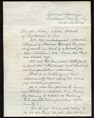 EWP 2-5A Petition High School Petition addressed to O.L. Emerick, Superintendent, and members of the Loudoun County School Board from citizens of Loudoun County. The petitioners respectfully request that the Board build and maintain an accredited, up-to-date high school for the “colored children of our said County.” They state that the Board is maintaining 23 public schools for African American children, and argue that “our race is justly entitled to at least one High School in the County.” Without such a facility, families are compelled to send their children outside the county to complete their education. The petitioners pledge private contributions to support the effort, noting that “there are other sources of aid such as the Rosenwald and other funds,” but emphasize that this funding must be supplemented by a public appropriation from the Board. They close by affirming that “this request is a fair and reasonable one under the circumstances.” The document includes signatories in support.