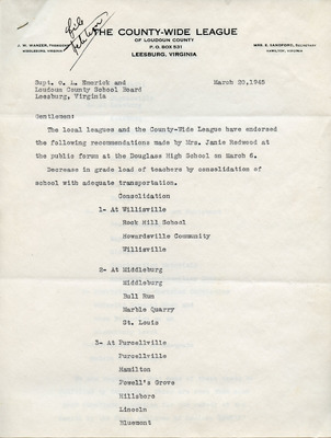 This petition from The County-Wide League responds to the March 6, 1945, public forum on educational equity and supports recommendations by Janie Redwood. The petition calls for reduced teacher loads through school consolidation, improved transportation, adequate supplies, and enriched curricula for Negro children in Loudoun County. It urges implementing some urgently needed measures by September 1945 to address safety and health concerns. The document also expresses appreciation for public discussion on educational opportunities under the segregated (Jim Crow) system and supports a proposed tax rate increase by the Board of Supervisors.