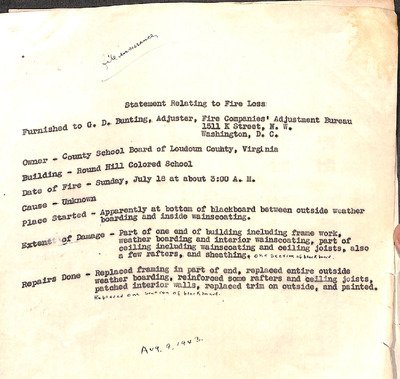 EWP 11 Yr 1943 Aug Round Hill Colored School Fire Loss.