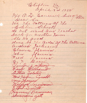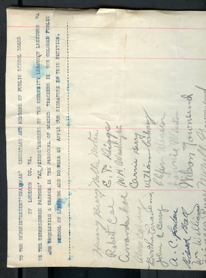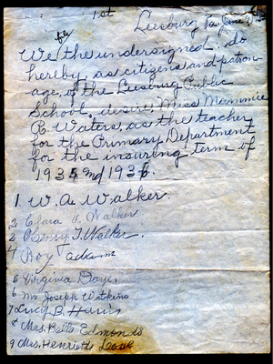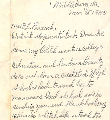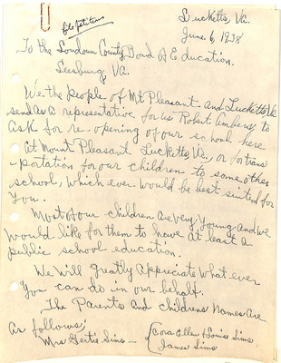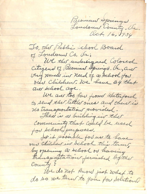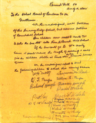EWP 02-5 A Yr Unknown Petition for school bus transportation for colored students to the Loudoun County Training Center Date unknown, but because the petition requests school bus transportation for colored students to the 'Loudoun County Training Center' it's assumed to be Pre-Douglass High School (1941). Students are from Willisville, St Louis, Middleburg Colored, Bull Run (Aldie) and Gleedsville (Mountain Gap Colored).