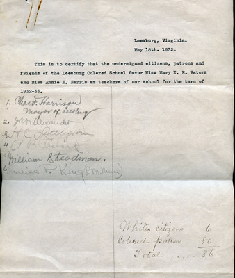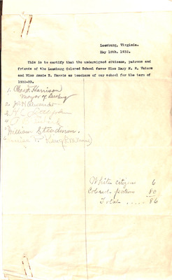 EWP 2-5A Petition Leesburg 1930 This document shows 2 letters. The first dated May 14, 1930, addressed to To the superintendent and Public School Board of Leesburg School District in Leesburg, Virginia, demonstrates the efforts made by patrons and taxpayers of the Leesburg School District to advocate for the appointment of a qualified individual as the fourth teacher at Leesburg Colored Public School. The signatories express their desire for a High School and Normal School graduate to be appointed as the Principal of the school, highlighting the importance they placed on education and the qualifications of the teaching staff. The second letter addressed to Mr. Robert M Coe is the response from the Division Superintendent (O. L. Emerick) indicating a willingness to consider the request and states an intention to recommend a teacher with the requested qualifications or higher for the position.