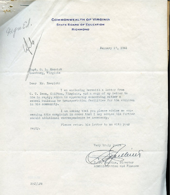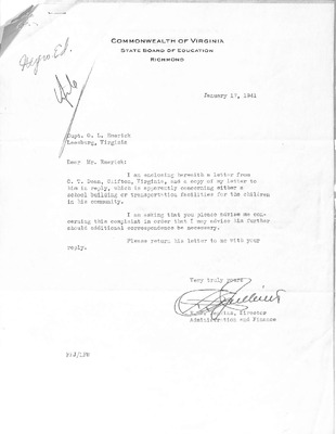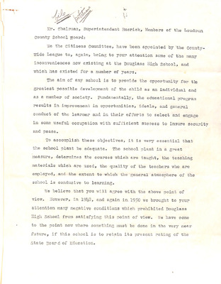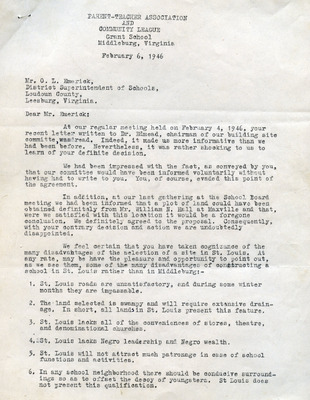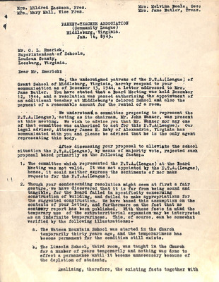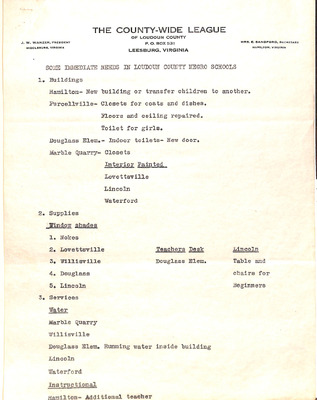 EWP 02-5 A March 20, 1945 County-Wide League of Loudoun letter to Superintendent O.L. Emerick and School Board endorse Janie Redmond recommendations made on March 6, 1945. March 20, 1945 County-Wide League of Loudoun letter to Superintendent Emerick and School Board endorses Janie Redmond recommendations made on March 6, 1945. These included Teacher Grade load decrease through school consolidation, providing necessary transportation, building repairs, school supply requests, infrastructure upgrades, additional teachers and maintenance custodians