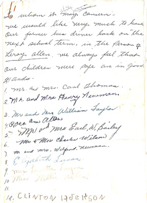 EWP 02-5 A Yr 1954 Letter from parents to Loudoun County School Board requesting Leroy Allen continue as school bus driver in the coming school year. Date unknown, but it is very likely the letter from parents that is referenced in the May 10, 1954 School Board Meeting Agenda requesting School Bus Driver Leroy Allen be reappointed for the coming school year. (See also EWP 2-2 May 10, 1954 School Board Meeting Agenda and Minutes)
