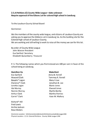 EWP 2-5A Loudoun County Training Center 001 This text is a petition addressed to the Loudoun County School Board, expressing concern over their plan to purchase land adjacent to the colored high school in Leesburg, Virginia. The petitioners argue that the land is needed for the expansion of the nearby Union Cemetery, which serves as a burial ground for the community. They also point out that only a few colored children attending the high school actually live north of Market Street, where the proposed land is located. The petitioners believe that the location of the land is not suitable for the future needs of the colored children's education, given its remote nature and distance from where the majority of the students reside. Ultimately, they request that the School Board reconsider their decision to purchase the land and prioritize the best interests of the colored youth in the community. (Single Page no petitioners list)