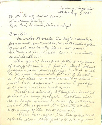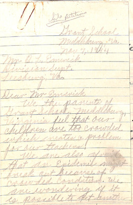 EWP 2-5A Petition St. Louis School- Overcrowding Feb 1931 This document is a petition expressing concern for severe overcrowding at the St. Louis School. On February 9, 1931, Laura Cook, a teacher at the school, wrote to the Loudoun County School Board describing how the enrollment of 71 students was hindering her ability to give each child adequate attention. The letter, co-signed by parents and community members, requested an additional classroom and a second teacher for the next school term. The petitioners urged the school board to approve and support these measures to improve learning conditions. The document indicates that a teacher report was attached; however, it is not included with the scanned copy.