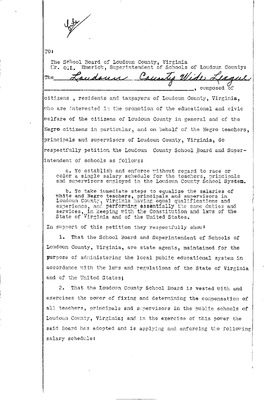 EWP 2-5A 1-1-2 Yr 1940 Petition by L County Wide League for Equal Salaries In this petition dated October 9, 1941, The Loudoun County Wide League, a group advocating for educational and civic welfare in Loudoun County, Virginia, called for the establishment of a single salary schedule for teachers, principals, and supervisors without regard to race. They highlighted the disparities in salary between white and Negro educators in Loudoun County, noting that even with equal qualifications and experience, white educators were paid more. Referencing a recent federal court decision in a similar case in Norfolk, Virginia, they argued that such salary differentials based on race were unconstitutional. The petitioners acknowledged that the practice was not initiated by the current leadership but urged the School Board and Superintendent to rectify the situation to align with democratic principles and the law.