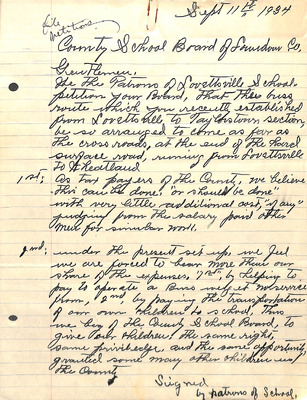EWP 02-5 B September 11, 1934 Petition from Patrons of Lovettsville school for school bus route adjustment September 11, 1934 petition from patrons of Lovettsville school to adjust newly established school bus route so that it extends to the road from Lovettsville to Wheatland.