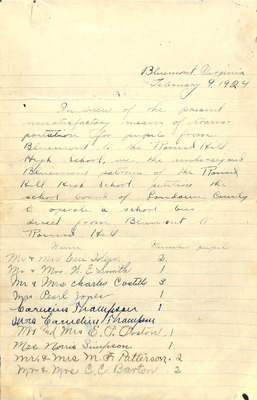 EWP 02-5B Yr 1924 Petition for school bus to Round Hill High School for Bluemont students February 9, 1924 petition from patrons of Bluemont students attending Round Hill High School for school bus transportation.