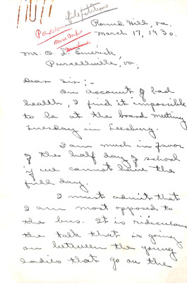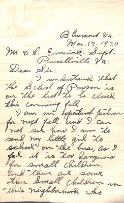 EWP 02-5B Yr 1930 Petition to keep Paxson school open and not have young students ride on the bus with Round Hill High School students March 17, 1930 letter from Mrs. Walter Parks to Superintendent OL Emerick joining in on the petition to keep Paxson school open instead of closing it and having elementary school students ride on the bus with Round Hill High School students.
