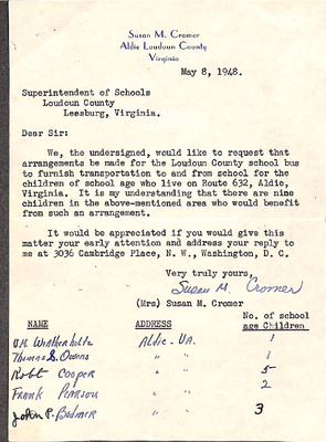 EWP 02-5 B Yr 1948 Request School Buses for Aldie Children on Route 632 May 8, 1948 and May 22, 1948 correction petition from Susan M. Cromer to Loudoun County Board of Supervisors. Petition request school bus transportation for Aldie children living on route 632. Petition contains parents names and ages of children to be transported.