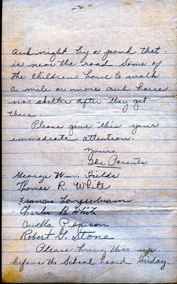 EWP 02-2 Yr 1952 Letter requesting school bus route extension for Bus 20 (O.L. Jacobs school bus driver) - page 2 September 8, 1952 correspondence to O.L. Emerick and School Board to extend Bus 20's route (O.L. Jacobs school bus driver). Submitted by parents: George Fields, Thomas White, Frances Longesbram, Charles White, C. Pearson and Robert Stone - page 2 -