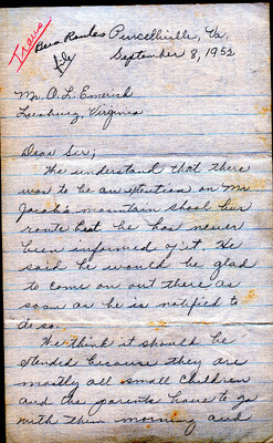 EWP 02-2 Yr 1952 Letter requesting school bus route extension for Bus 20 (O.L. Jacobs school bus driver) - page 1 September 8, 1952 correspondence to O.L. Emerick and School Board to extend Bus 20's route (O.L. Jacobs school bus driver). Submitted by parents: George Fields, Thomas White, Frances Longesbram, Charles White, C. Pearson and Robert Stone - page 1 -