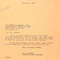 letter, dated, January, 1940, Arthur Spamer, Clerk, United States District Court, Baltimore, Maryland, O. L. Emerick, Division Superintendent, final judgment, decree, Walter Mills, Board of Education, Anne Arundel County, copy, costs, legal proceedings, administrative matters, education system, judicial system, bureaucracy, correspondence, historical evidence, legal processes, educational policies.