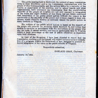 Page 15 The Gray Commission Report continuation of Appendix I reinforces the Commission's assertion that a significant majority of Virginians oppose school integration, as evidenced by petitions, communications, and resolutions from local government bodies and organizations. It argues that integrating schools against public sentiment would destabilize or severely harm the public school system, particularly since local funding plays a major role in education in Virginia. The Commission concludes by committing to developing a legally viable strategy to prevent enforced integration while maintaining control over the state's education system.