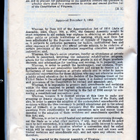 Page 18 of the Gray Commission Report Appendix III introduces a proposed bill to hold a public referendum on whether to convene a constitutional convention to amend specific provisions of the Virginia Constitution related to education funding. The bill argues that a convention is necessary to revise constitutional restrictions that currently prevent public funds from being used for private school tuition, particularly affecting war orphans, handicapped students, Negro graduate students, and future teachers and nurses. To avoid broader constitutional debates and ensure swift approval, the bill limits the convention’s authority to only those amendments necessary for implementing educational aid programs and maintaining segregated schooling.