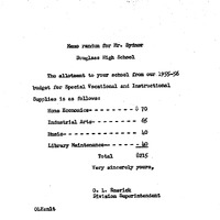 memo, 1955, budget, allocation, Special Vocational, Instructional Supplies, Douglass High School, Home Economics, Industrial Arts, Music, Library Maintenance, O.L. Emerick, Division Superintendent, resources, vocational programs, instructional programs, education, mid-20th century, practical skills, students
