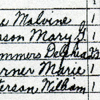 - names, list, Malvine Page, Mary G Peterson, Delhiam Summers, Marie Warner, William Peterson, numbers, roster, directory, census, record-keeping, structured system, social networks, communities, organizations