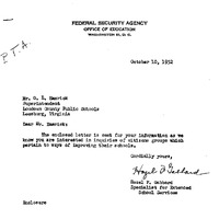 letter, Federal Security Agency, Office of Education, Washington D.C., Mr. O. L. Emerick, Loudoun County Public Schools, citizen groups, educational reform, stakeholders, public education, early 1950s, collaboration