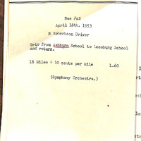 April and May 1953 invoices and payments for 4/16/1953 school bus trip from Ashburn to Leesburg in support of symphony orchestra. Invoice and payment for 5/15/2953 trips from Ashburn and Leesburg to Washington DC. Also, a thank you letter dated June 8, 1953 from Ashburn and Mountain Gap schools for Emerick's permission to take a June 2, 1953 trip to Richmond, Colonial Williamsburg, Jamestown and Yorktown.