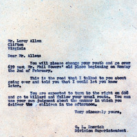 January 28, 1953 correspondence from Superintendent O.L. Emerick to bus driver Lee Roy Allen (Bus #35). The correspondence directs Mr. Allen to change the route of school bus # 35 (presumed effective for the remainder of the 1952/53 school year). School bus # 35 served Conklin Elementary.
