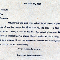 1952, correspondence, O.L. Emerick, J.H. Forsyth, bus route change, bus # 26, Mountain Gap School